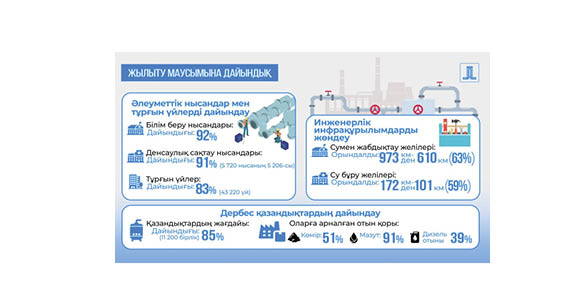 Бүгінгі таңда білім беру және денсаулық сақтау нысандарының дайындығы еліміз бойынша орта есеппен 90%-дан, тұрғын үйлер дайындығы 83%-дан асады. Сумен жабдықтау желілерінде жөндеу жұмыстары 63% орындалды.