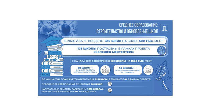 🏫 2024-2025 жылдары жарты миллионнан астам орындық 359 мектеп, оның ішінде «Келешек мектептері» жобасы аясында 173 мектеп пайдалануға берілді. Жыл басынан бері 102 мектеп салынды (153,8 мың орындық), оның 68-і жоба шеңберінде, ал 34-і бюджеттен тыс қаражат көздер есебінен. Жыл соңына дейін тағы 92 мектеп, оның ішінде жоба аясында 44 мектеп ашу жоспарлануда.