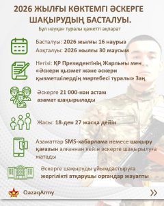 Мемлекет басшысы «Әскери қызметтің белгіленген мерзімін өткерген мерзімді әскери қызметтегі әскери қызметшілерді запасқа шығару және Қазақстан Республикасының азаматтарын 2026 жылдың наурыз-маусымында және қыркүйек-желтоқсанында мерзімді әскери қызметке кезекті шақыру туралы» Жарлыққа қол қойды.